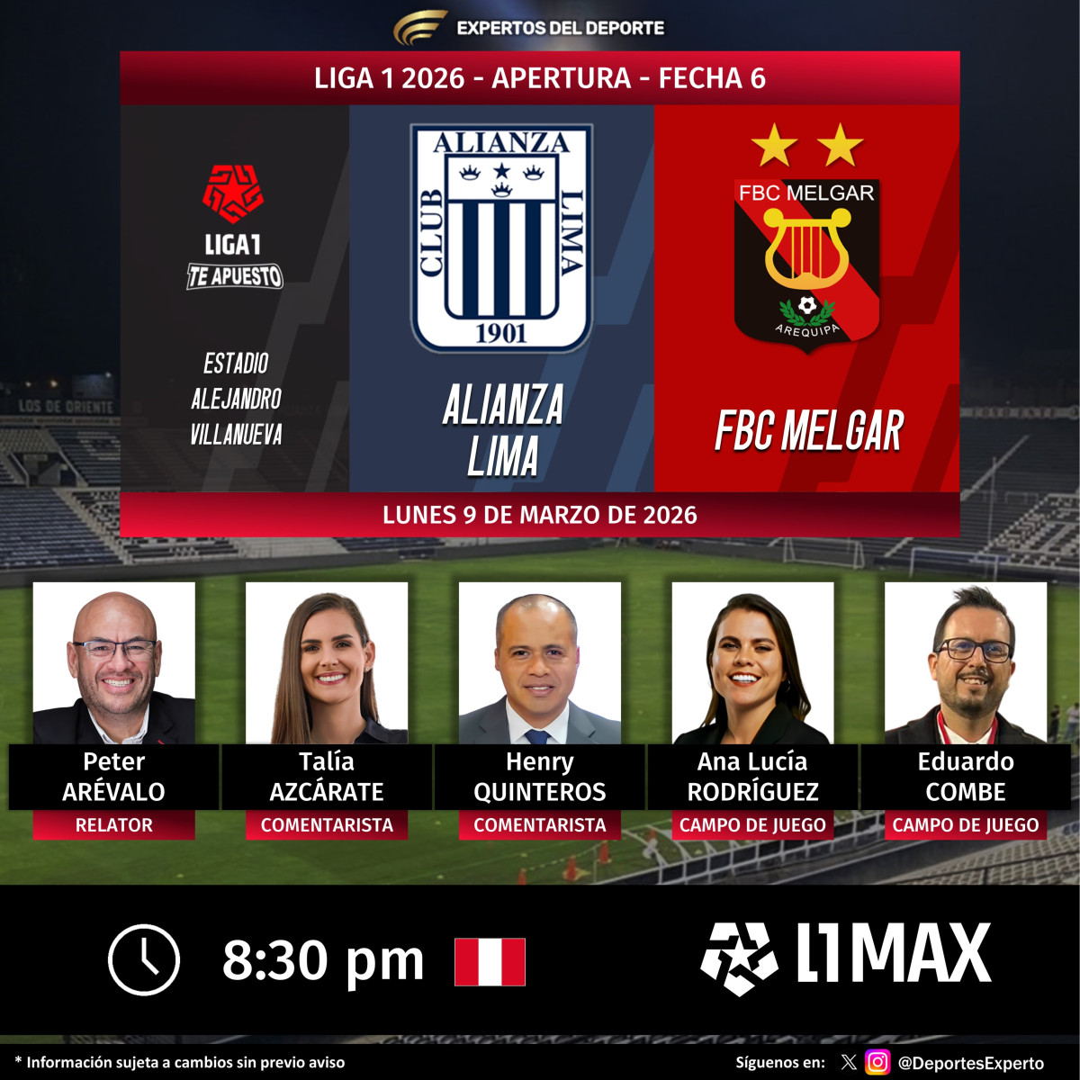 La transmisión del Alianza Lima vs Melgar por la sexta jornada del Torneo Apertura 2026 estará a cargo de L1 Max para todo el Perú. El espacio está disponible en diversas cableoperadoras, como DirecTV, Claro TV, Movistar TV y Best Cable, además de servicios de internet como WIN, MiFibra, Wow, entre otros.