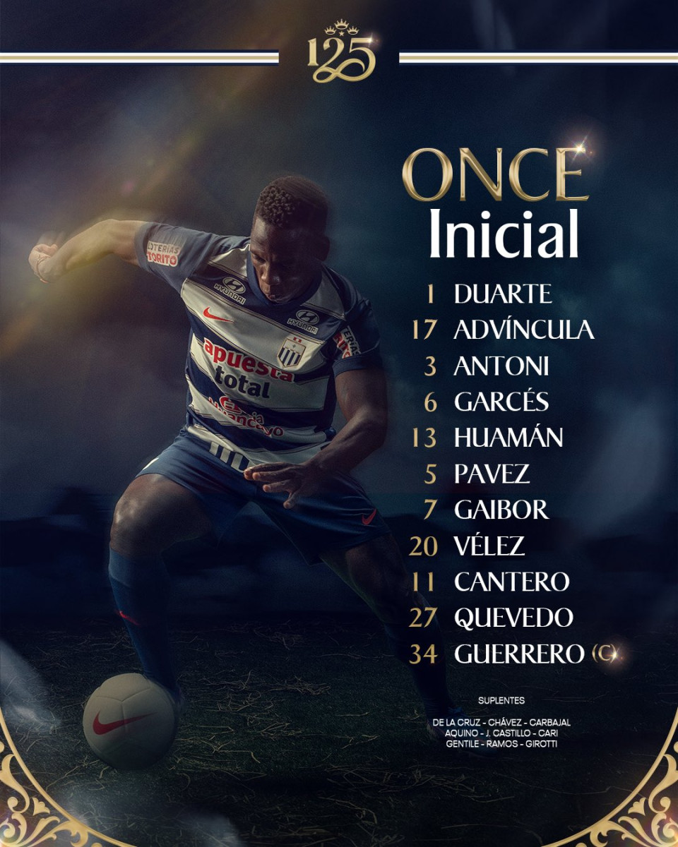 - Alianza Lima: Alejandro Duarte; Marco Huamán, Renzo Garcés, Gianfranco Chávez, Cristian Carbajal; Esteban Pávez, Jairo Vélez, Alan Cantero; Luis Advíncula, Gaspar Gentile y Paolo Guerrero.