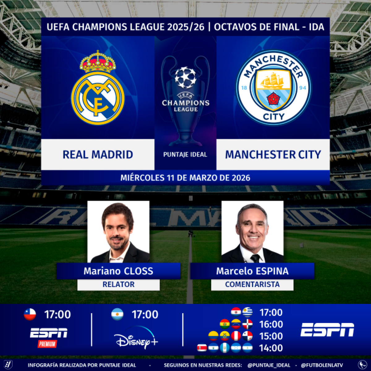 Mariano Closs y Marcelo Espina serán los periodistas encargados de los relatos del Real Madrid - Manchester City.