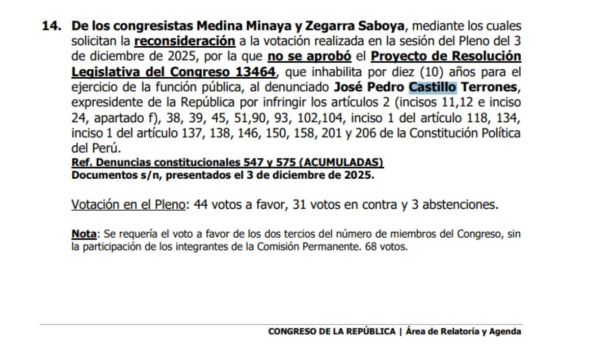 El Pleno del Congreso revisará la reconsideración a la votación de la inhabilitación contra el expresidente Pedro Castillo. En diciembre, no se llegó a conseguir los votos necesarios para lograr su inhabilitación por el intento de golpe de Estado en diciembre del 2022.
