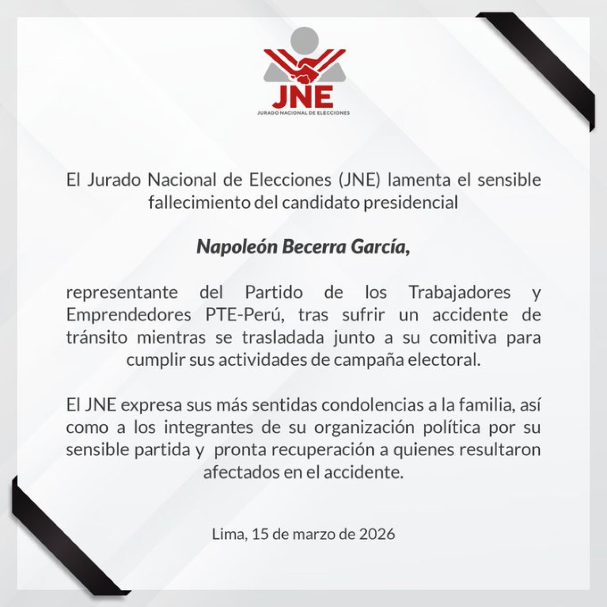 El candidato presidencial del Partido de los Trabajadores y Emprendedores (PTE-Perú), Napoleón Becerra, falleció este domingo 15 de marzo en un accidente de carretera en Rumichaca, Ayacucho. El aspirante al sillón presidencial se dirigía a una actividad de campaña que estaba programada para el 15 de marzo a las 9 de la mañana en Tambo-La Mar, de cara a las Elecciones 2026.