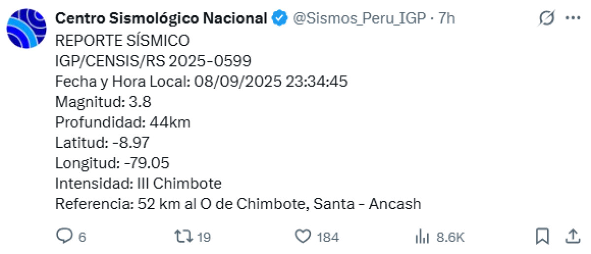 Según el reporte sismo del Instituto Geofísico del Perú, durante la madrugada de ayer, martes 9 de septiembre, la ciudad de Áncash registró un sismo de magnitud 3,8. El movimiento telúrico se registró a 52 km al oeste de Chimbote.