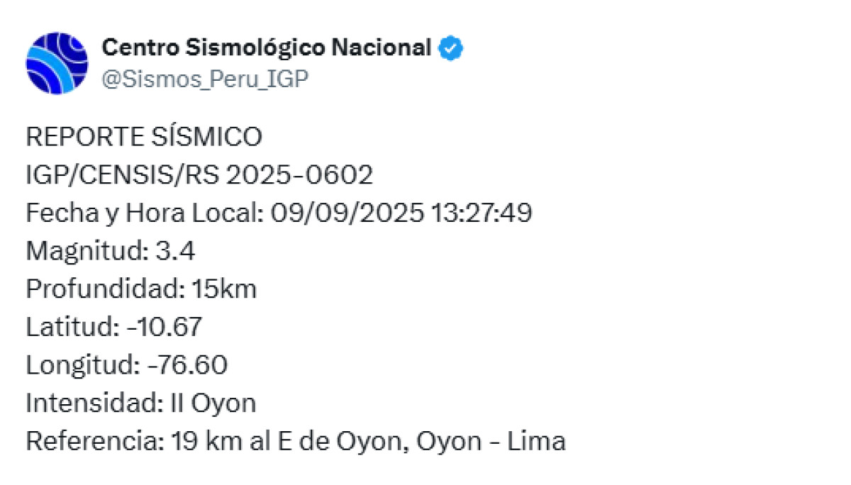 Según el reporte sísmico del Instituto Geofísico del Perú, durante la mañana del martes 9 de septiembre, a las 1:27 p. m., se registró un sismo de magnitud 3,4 en la ciudad de Oyon. El movimiento telúrico tuvo su epicentro a 19 km al este de Oyon, provincia de Oyon, región Lima.